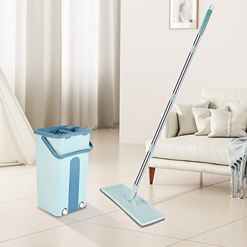Bodenwischer mit Eimer,Wischmopp Set Inklusive 1-Wischmopp mit Stiel, 1-Entwässerungseimer/Putzeimer zur Nass- und Trockenabscheidung,und 2-Wiederverwendbare Moppköpfe (A-Grün)